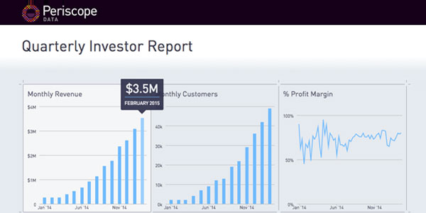 Periscope Data is a data analysis tool that unifies business data across multiple different data sources. By plugging into database, marketing and billing systems, it can show customers how email and SMS affect user retention as well as which sales channels produce the most loyal users, and how many users use both web and mobile frontends. The company is founded in 2012, by ex-Google AdWords and Microsoft Bing PMs and engineers who have worked together for several years.
