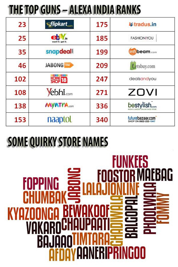 Flipkart stands at the top of the charts followed by ebay at second and SnapDeal at third. As per the rankings of Alexa India for the top 500 websites in India, Flipkart and ebay take the twenty third and twenty fifth positions respectively. The online apparel store Jabong tells an impressive story by reaching the fourth position of the list within a year’s time.