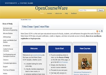 Notre Dame OpenCourseWare is an initiative by the University of Notre Dame to make materials from various courses freely available on the web. Launched September 30, 2006, Notre Dame's OCW program offers courses across two dozen of its departments, from aerospace engineering and classics to mathematics and theology. Each course includes a syllabus; others have class structure outlines.