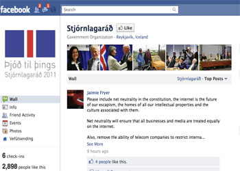 Two thirds of Iceland's population (approximately 320,000) is on Facebook, so the constitutional council used Facebook to rewrite its constitution where citizens could use the social network to make their own suggestions, engage in online debates, or follow the proceedings in real-time. (Source:ZDNet)