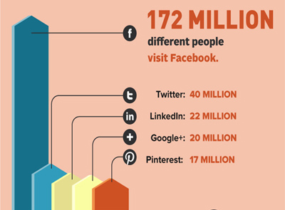 4. About 172 million different people visit Facebook in 24 hours. That’s around 10 times the number of people who visit Pinterest in the same amount of time. In one day, other social networks see close to Pinterest’s level of activity: Twitter sees 40 million individual views; LinkedIn has 22 million users visiting, and Google+ has 20 million different users visiting the site.