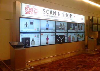 As a part of its mobile platform launch, HomeShop18 set up SCAN N SHOP Virtual Shopping Wall at Terminal 3 of Indira Gandhi International Airport domestic departure wing at New Delhi. The virtual wall comprises dynamic LED TV screens. Each TV screen displays products on sale accompanied by a unique QR code, which people may scan to display the respective product's details. The customers can place their orders by scanning the QR code against each item or over the phone, through Cash on Delivery.