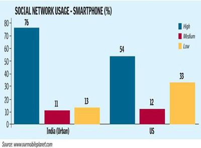 When it comes to accessing emails and social networking sites on their smart phones Indians core higher. The survey says compared to 54 per cent in the US, 76 percent of smartphone users in India access social networking sites on their devices.