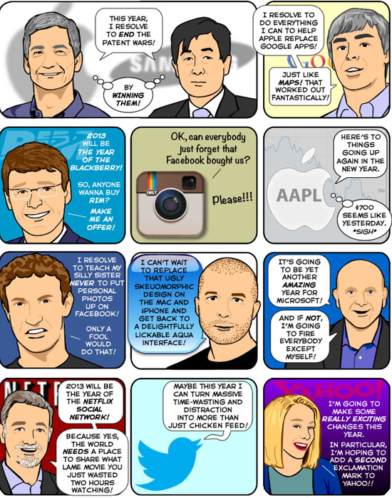 Bangalore: Like the rest of the world, you too have made a couple of resolutions in the New Year and probably, most of them would have been broken by now. But have you thought about the possible resolutions, which could be made by some of the hottest executives and celebrities in tech industry including Facebook’s Mark Zuckerberg, Google’s Larry Page, Apple’s Tim Cook, Yahoo’s Marissa Meyer and Microsoft’s Steve Ballmer? It could range from taking their companies into new directions to ending the year old patent wars. If you don’t know about any of these resolutions, here is an interesting comic made by Nitrozac and Snaggy at Joy of Tech.