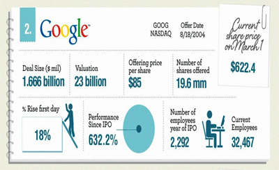 2. Google: Google went public in 2004, with a deal worth $1.6 billion. As of March 1, 2012, the firm is valued at 23 billion and saw a rise of 18 percent in value on the first day it went public. According to the infographic, the world’s largest search engine had more than 2,000 employees the year it went public. Today, it has around more than 10 times as many people working for it, and has registered growth of 632.2 percent. Being an American company, it is headquartered in California, but has offices all over the world.