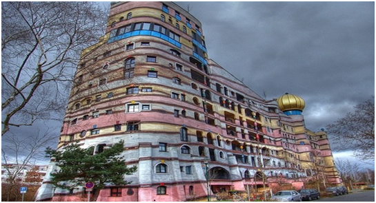 designed by Austrian artist Friedensreich and planning was done by architect Heinz M. Springmann. This amazing building contains 105 apartments on 12 floors with an inner courtyard, small artificial lake and a playground.