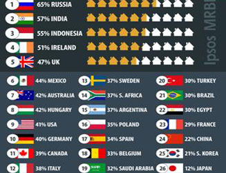 Majority (65 percent) of people in Russia think next 30 days would be a good time to buy property followed by India (57 percent), Indonesia (55 percent), Ireland (51 percent), Great Britain (47 percent), Mexico (44 percent), Australia (42 percent), and Hungary (42 percent). Those rounding out the middle of the pack are from the United States (41 percent), Germany (40 percent), Canada (39 percent), Italy (38 percent), Argentina (37 percent), South Africa (37 percent), Sweden (37 percent), Poland (35 percent) and Spain (34 percent). Those least likely to say ‘yes’ are from Belgium (33 percent), Saudi Arabia (32 percent), Brazil (30 percent), Turkey (30 percent), Egypt (30 percent), France (29 percent), China (22 percent), South Korea (21 percent) and Japan (12 percent).