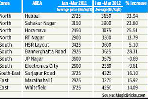 In the first quarter of 2012, capital values in Hebbal recording 33.94 percent increase at rs3650 per square feet, which is more compared to the same period previous year. After Hebbal, Horamavu stood at second position in the capital value appreciation that rose 25.51 percent to rs3075 per square feet. Sahakar Nagar also scored well on list with a 23.80 percent increase at rs3900 per square feet.