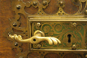 The decoration of an ornate lock or Manichithra-thaazhu can be seen in the front doors of many urban Kerala houses. Usually, the ornate lock are made up of gold-plated metal and engraved with intricate designs. This everlasting design adds an impression of elegance and splendor to any entrance.