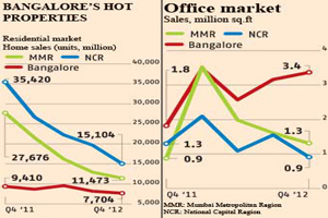 Bangalore is not only leading in the real estate market in India, but also the city has witnessed highest absorption rate in office space compared to other metros. In the last quarter of financial year 2012, about 3.4 million square feet of office space were sold in Bangalore, which is 89 percent higher than the equivalent quarter of the last year. In contrast to this, the office space absorption in Delhi-NCR fell from 1.3 million sq ft in Q4 of 2011 to 0.9 million sq ft in Q4 of 2012, according to data collected by Knight Frank, a global realty consultant. But in Mumbai, the absorption of office space rose to 1.3 million sq ft in Q4 of 2012 from 0.9 million sq ft in Q4 of 2011.