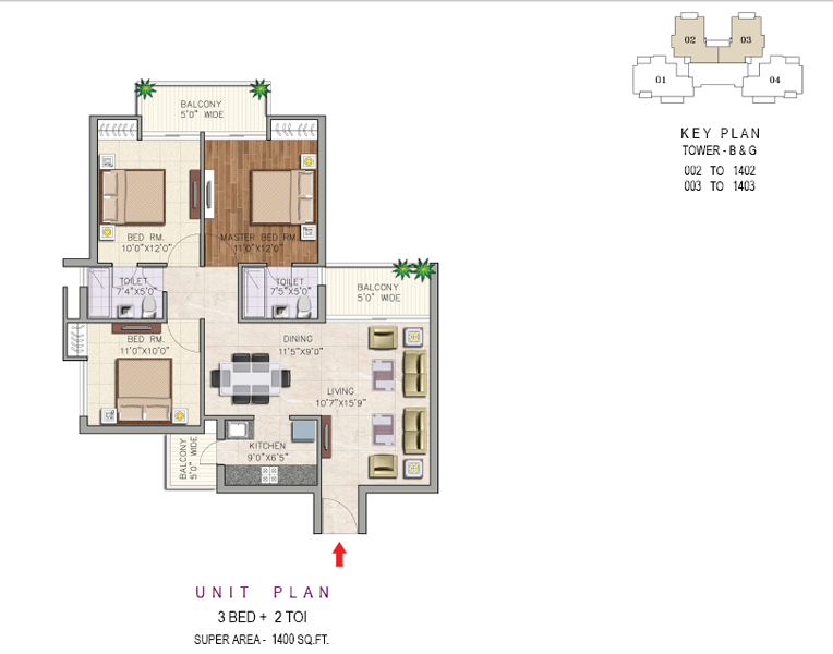 3 BED + 2 TOI (1400 SQ.FT