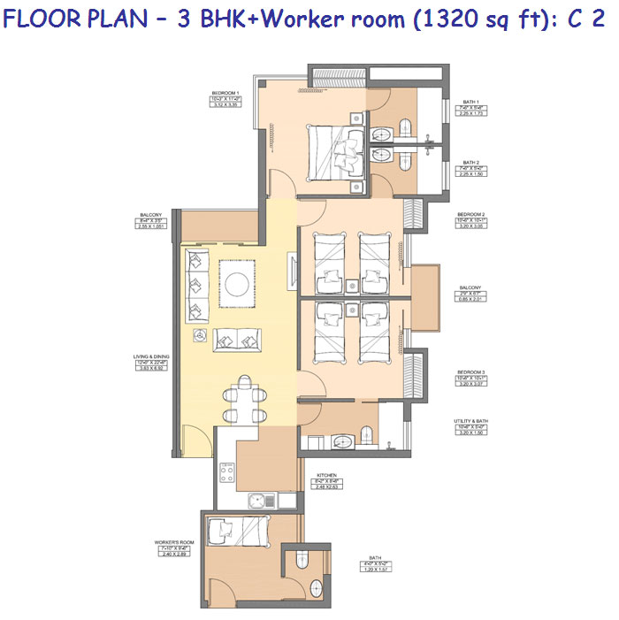 3BHK + Worker Room (1320 Sq.Ft) C2