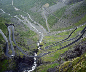 Trollstigen road is one of the most popular roads which has has a steep incline of 9 percent and consists of 11 hairpin bends up a steep mountainside. Encircling the road are lofty mountains such as Kongen (the King), Dronningen (the Queen) and Bispen (the Bishop). This road is very narrow and leaves very few possibilities for vehicles to pass each other but once you get there at the top its all worth watching cars creeping up the steep and narrow road like ants, taking photos from one of many viewpoints along the way or enjoying the waterfalls (Stigfossen Waterfall ) gushing down the mountainside beside the road is good fun.