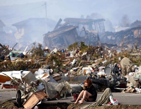 15. A woman cries while sitting on a road amid the destroyed city of Natori, Miyagi territory in northern Japan after the massive earthquake and tsunami