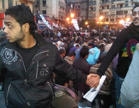 16.Christians protect Muslims during prayer in the midst of the uprisings in Cairo, Egypt, in 2011.