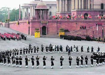 Drummer's Call: The three band contingents march forward and take position close to the President's seat. The drummers, mostly from the pipe bands, give a solo performance, known as the Drummer's Call.