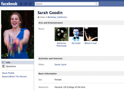 Sarah was the first women in Facebook. Her profile says Samyr Laine, one of early Facebook member in her activities and interests.
