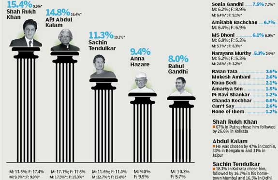 Neither the recent slapgate dent SRK’s popularity, nor the row over Kudankulam N-plant did hurt Kalam’s image, and obviously not Team India’s poor show in Australia or the endless wait for his hundredth hundred affected Sachin’s fame in the country and they are the top three personalities the Indian youth look up as their best role models. While 15.4 percent voted Shah Rukh Khan as their best role model, APJ Abdul Kalam came second in popularity among the youth with 14.8 percent and Sachin was liked by 11.3 percent in the country. 67 percent chose Shah Rukh  as their role model followed by 26.6 percent from Kolkata. The Badshah of Bollywood registered 5.8 percent in popularity from the previous year. Anna Hazare came fourth with 9.4 percent and Rahul Gandhi in the fifth position with 8 percent of youth’s favorite. Kalam was chosen by 47 percent in Cochin, 22 percent in Bangalor and 31 percent in Jaipur. Sachin is the best icon for 18.3 percent in Calcutta, 16.7 percent in his home town Mumbai and 16.5 in Delhi. Sonia Gandhi, Amitabh Bachchan, Ms Dhoni, Narayan Murthy, Ratan Tata, Mukesh Ambani, Kiren Bedi, Amartya Sen, Pt. Ravi Shankar and Chandra Kochar were the other eminent personalities in country that the youth consider are the role models. 2.6 percent of surveyed youth said they can’t say who their role model is and 1.2 percent did not consider any of the above as their role models.