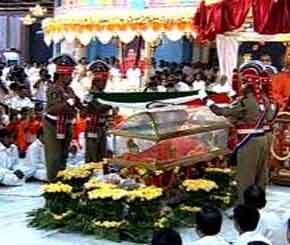 Satya Sai baba was buried inside the Sai Kulwant Hall at the Prasanthi Nilayam ashram in Puttaparthi. Sai Baba was a renouned figure therefore politicians and top bureaucrats attended his burial cerenmony, apart from family members of Baba and officials and members of the Sri Sathya Sai Central Trust. Sai Baba's nephew R.J. Ratnakar performed the last rituals .After the rituals were over, the God man was laid to rest in a 3 by 6 by 4.5 feet deep pit at a private ceremony which was conducted behind the curtains.