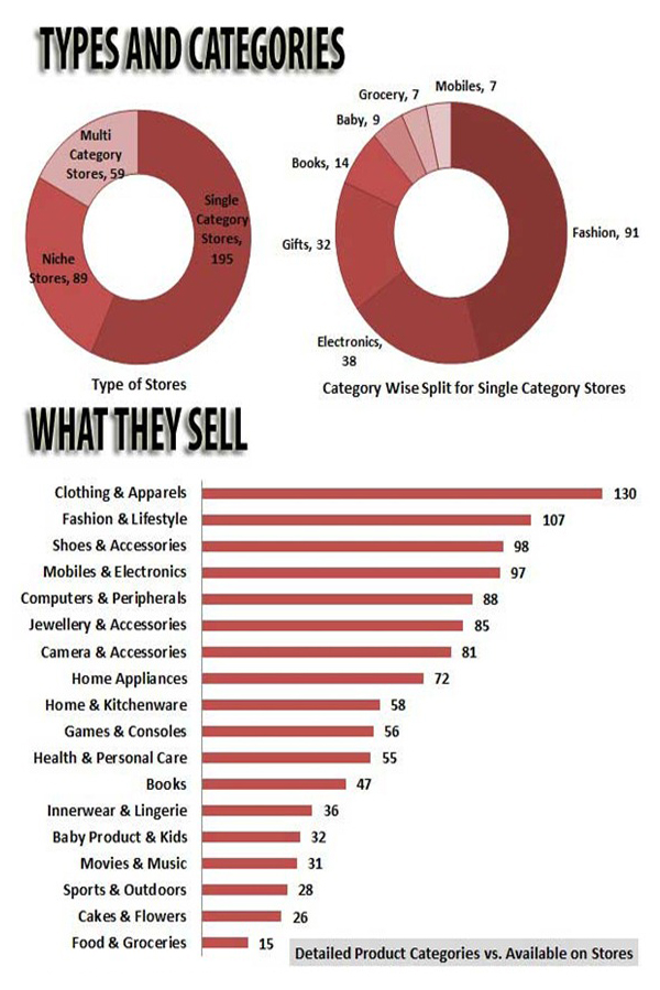 More than half of the stores sell a single category of products like books, media or electronics with only 59 stores selling multiple categories of items. Some stores classified as Niche sell only exclusive entities like travel books and novelty items.
