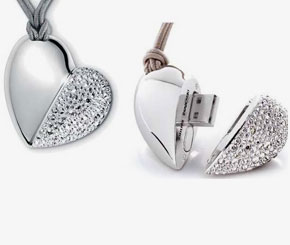 Keep your information close to your heart, yes its right. Here is a necklace for a woman which is actually a pen drive. This pen drive exactly looks like a stylish heart shaped pendent and comes with 2 GB, 4GB and 8 GB data storage models. This kind of pen drives are made up of stainless steels decorated with crystals which give a luxurious and stylish looks. The heart shaped pen drives are available at a starting price of 999.