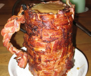 The Bacon Mug is everyone's fantasy nightmare, and you can see why. The making consists of biscuits (for molding the cup), cheese (both cream cheese and Swiss cheese), and lots and lots of bacon. This ungodly chalice of tummy ache reckons 2400 calories and 158 grams of fat at a least, so think of it this way: why lose more (bacon slices) if you're losing (dignity and self-respect) in the end anyways?