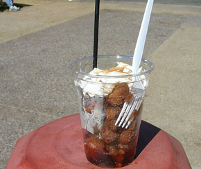 The frozen Coca-Cola-flavored batter is deep-fried and topped with Coca-Cola syrup, whipped cream, cinnamon sugar, and a cherry. This Southern brew is likely to have 830 calories per cup and 28 grams of fat, amount of servings in an average sitting!