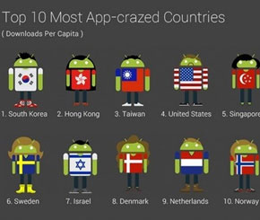 Singapore grabbed the No.5th rank, followed by Sweden in No.6th position, Israel (No.7), Denmark (No.8), Netherlands (No.9) and Norway (No.10). It was quite obvious to note the European countries like the UK, France or Germany failed to grab a position in the top 10 list. The biggest mobile phone markets like China and India, which has some cheapest android phones in the world, were also missing in the top 10 list, possibly that the Chinese and the Indians are not that crazy to download apps.