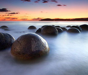 The are the big attractions which are unusually large and spherical boulders lying along a stretch of Koekohe Beach on the wave cut Otago coast of New Zealand between Moeraki and Hampden. They occur scattered either as isolated or clusters of boulders within a stretch of beach where they have been protected in a scientific reserve.