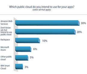 Among the developers planning to work with public cloud, 54 percent specified cloud of their choice. Amazon web services lead the list with 30 percent followed by Rackspace at 10 and Microsoft Azure at 6 percent.