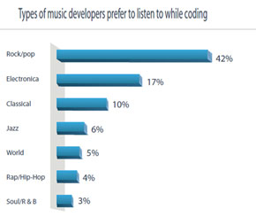 The taste for music is different for different developers. Almost half of them prefer listening Rock or Pop music and about 6 to 17 percent prefer electronica, classical and jazz. The most popular artist among coders is “Metallica”.