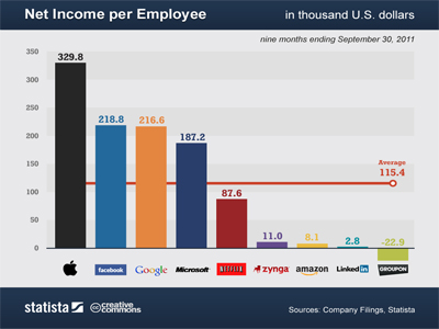 public yet—thus having the privilege to keep its financial numbers to itself). Apple again came first, with $329,800 dollars of net income going to each employee, followed by Facebook with$218,800 and Google with $216,600. Microsoft came in fourth on the list of nine, with $182,000, and Netflix followed at$87,600 after a substantial lag. Zynga and Amazon ranked under Netflix with $11,000 and $8,100 respectively. LinkedIn came in second-last with $2,800, and Groupon’s employees accounted negatively for the company, with -$22,900.