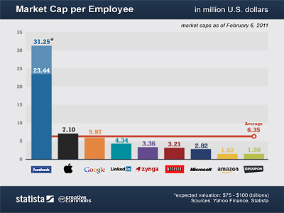 As of February 6, 2011, the market capital per employee was the most for Facebook, was $23.44 million, but market estimates of $75-100 billion dollars (since the social network had not gone public at the time) led to an approximate $31.25 million. It was followed by Apple which came in second with $7.10 million, and Google with $5.97 million at third place. LinkedIn came in at fourth place with $4.34 million, followed by Zynga having a market cap of $3,360,000 and Netflix with $3.21 million. Microsoft came in next with $2.82 million and Amazon came in second-last with $1.52 million. Groupon was last on the list of the nine Internet technology companies, with each employee contributing to $1.50 million of market capital.