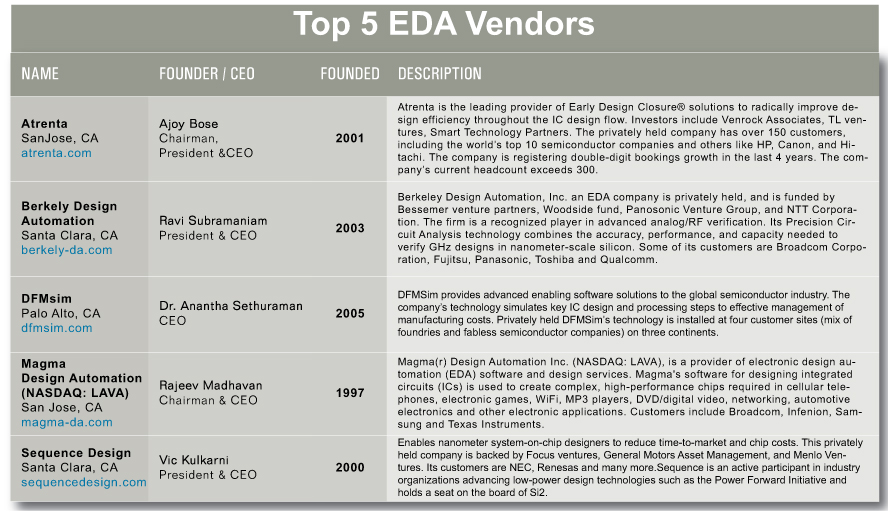 Top 5 EDA Vendors. These are companies that are founded or managed by Indians in the U.S. We have selected them because these are companies, which will more than likely to survive the year intact. These companies have a lot of momentum and will rise above the rest.